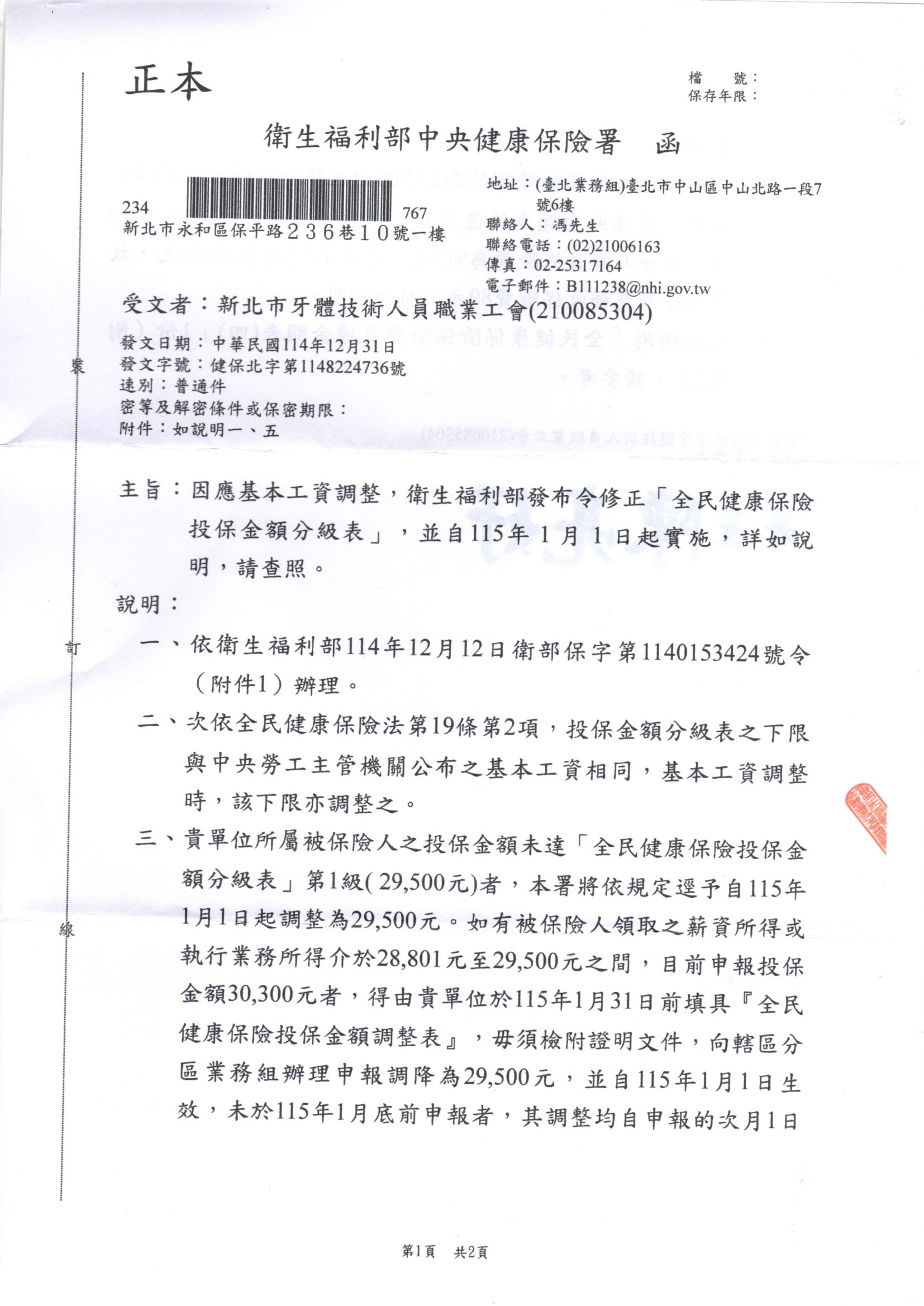 115年1月1日起保險費負擔金額表