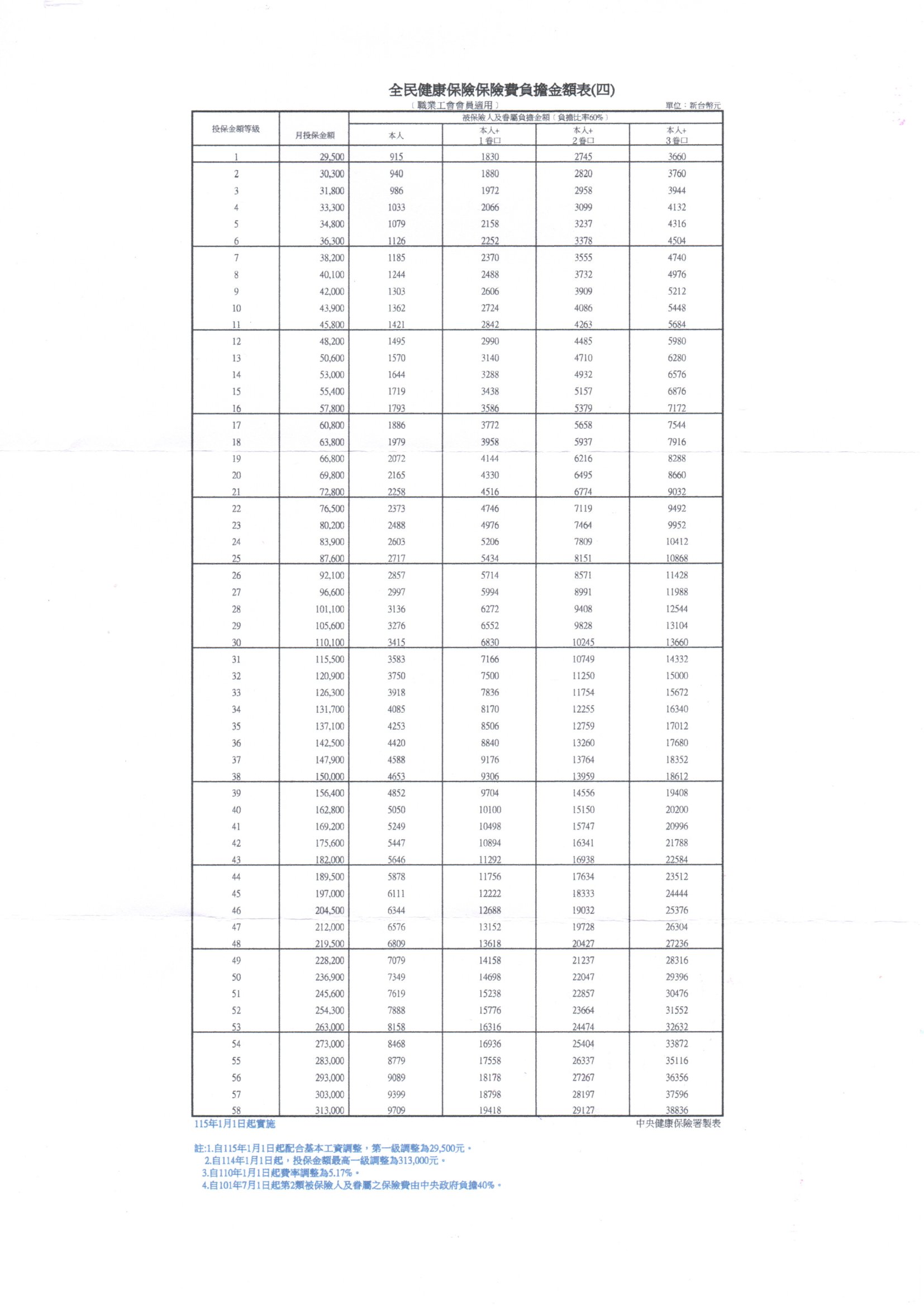 115年1月1日起保險費負擔金額表